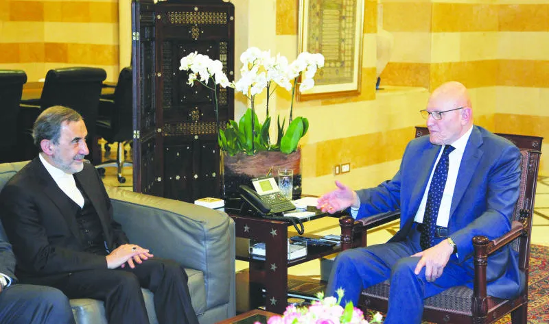 رئيس الوزراء اللبناني تمام سلام (يمين) أثناء لقائه مع علي أكبر ولايتي كبير المستشارين للمرشد الأعلى الإيراني علي خامنئي في بيروت أمس (دالاتي ونهرا)