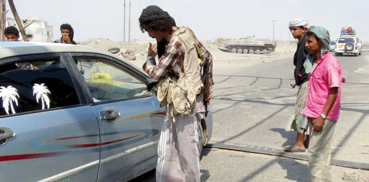 عضو في اللجنة الشعبية المؤيدة للحكومة اليمنية يستوقف إحدى السيارات بمنطقة تفتيش في محافظة أبين (رويترز)