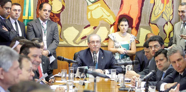 رئيس مجلس النواب البرازيلي إدواردو كونيا خلال اجتماعه مع رؤساء الأحزاب السياسية لتدارس إجراء إقالة الرئيسة اليسارية ديلما روسيف في برازيليا (إ.ب.أ)
