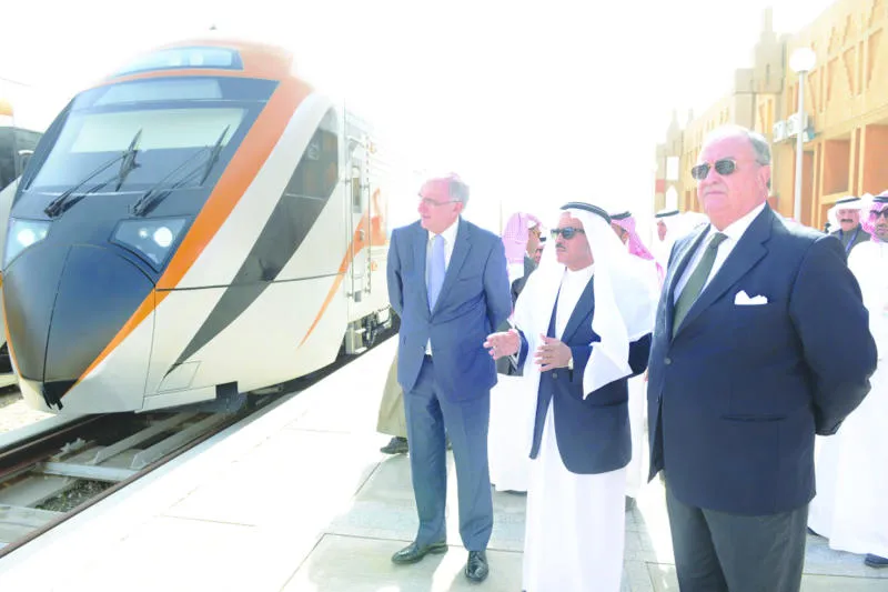 رئيس المؤسسة العامة للخطوط الحديدية والسفير الإسباني لدى تدشين أربعة قطارات بمدينة الدمام أمس («الشرق الأوسط»)