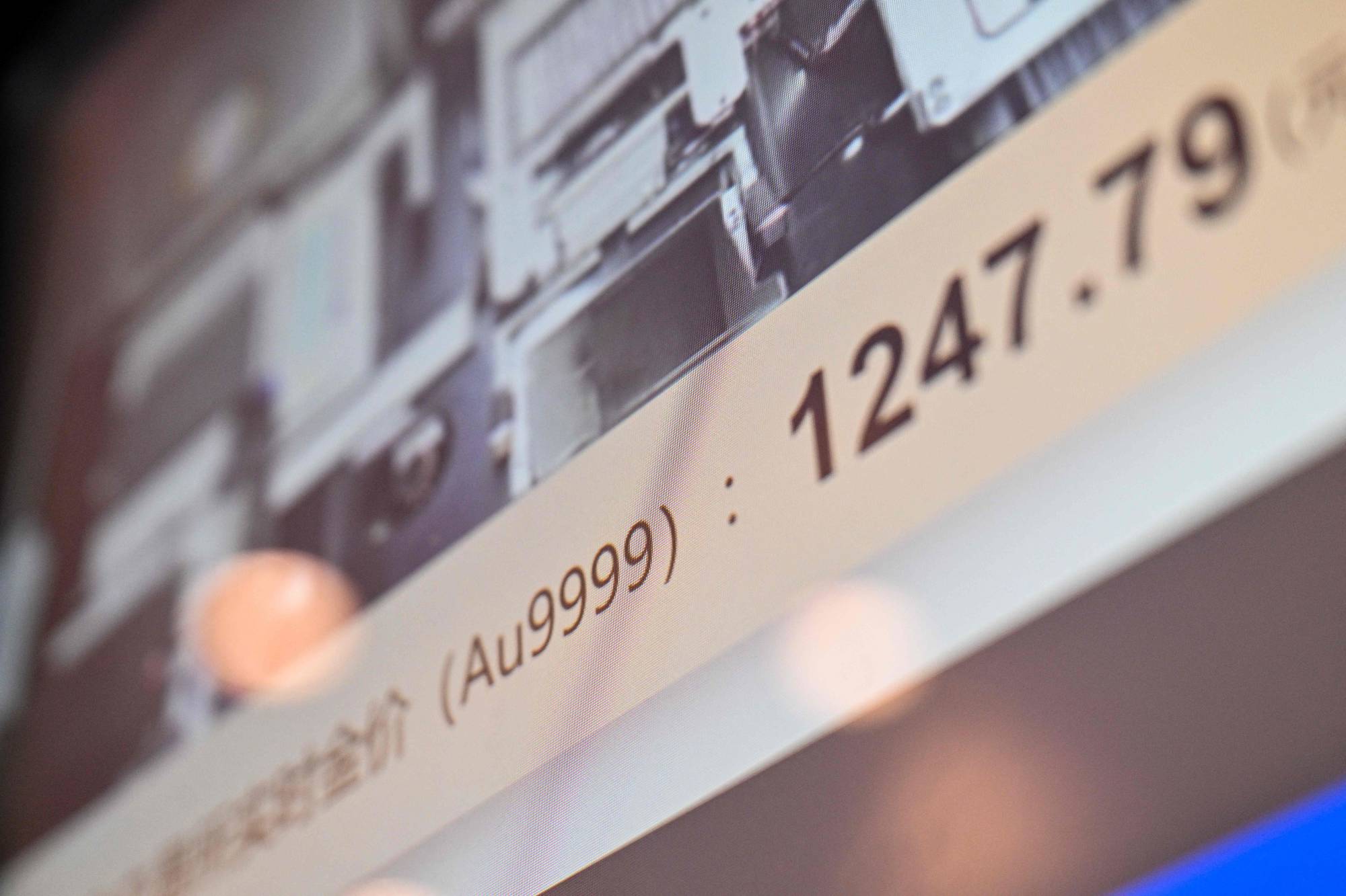 سعر الذهب في جهاز «متجر الذهب الذكي» الموجود داخل مركز تجاري بشنغهاي (أ.ف.ب)