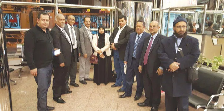 وفد الفريق الحكومي اليمني المشارك في المفاوضات قبل مغادرته الرياض متوجها إلى جنيف ( سبأ)