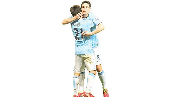 نصري يحتفل مع زميله سيلفا بهدف تأهل سيتي على حساب تشيلسي (أ.ب)