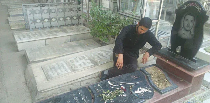 قبر الرائد محرم ترك من قوات {فيلق قدس} في طهران.. وهو أول قتيل إيراني في مهمة استشارية في سوريا.. ويعد قبره مزارًا للمقاتلين في الحرس الثوري يزورونه قبل توجههم إلى سوريا. وتقول مواقع إيرانية إن المقاتل الظاهر في الصورة قتل قبل أيام