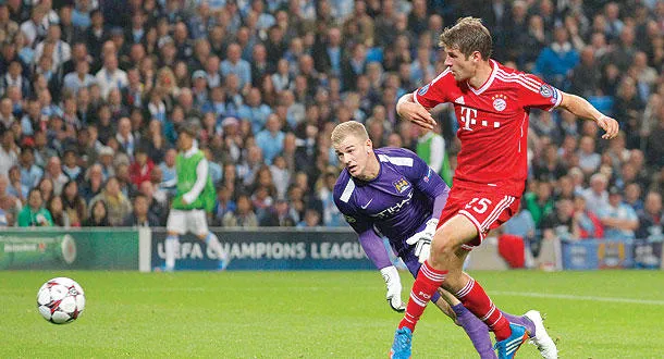مولر مهاجم بايرن ميونيخ يراوغ هارت حارس مانشستر سيتي ليسجل ثاني أهداف فريقه (أ.ب)