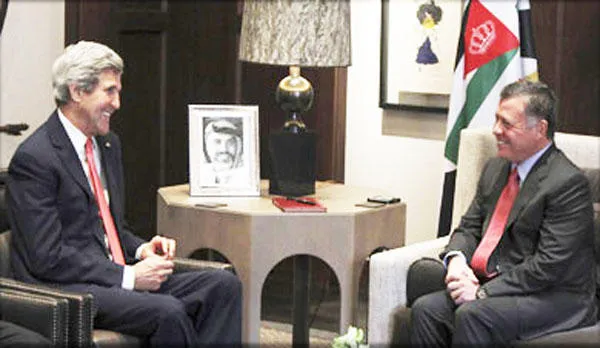 وقالت ماري هارف المتحدثة باسم الخارجية الأميركية للصحافيين الذين رافقوا كيري على متن الطائرة المتجهة من روما إلى الأردن: «سيجتمع مع الملك عبد الله ووزير الخارجية الأردني ناصر جودة الذي جاء معنا في الطائرة».
