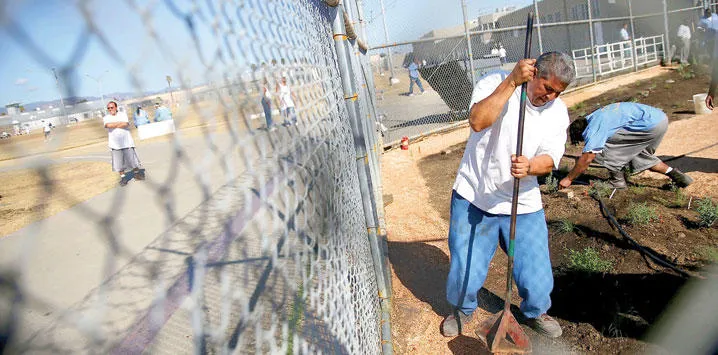 سجين بأحد سجون كاليفورنيا يقوم بأعمال الصيانة في حديقة الإصلاحية وسط تزايد الانتقادات لضباط السجون باستخدام القوة المفرطة (غيتي)