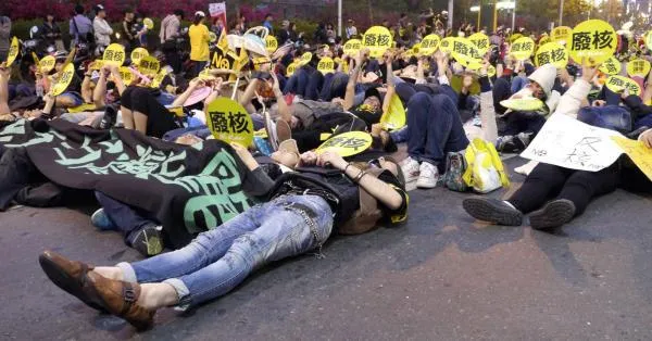 وفي مدينة كاوسيونغ بجنوب البلاد، استلقى أكثر من 20 ألف شخص في الشارع احتجاجا على الطاقة النووية، بحسب منظمة «مواطن الأرض تايوان» غير الربحية.