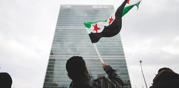 متظاهر سوري يرفع علم الثورة السورية أثناء انعقاد مجلس الأمن بخصوص سوريا (إ.ب.أ)