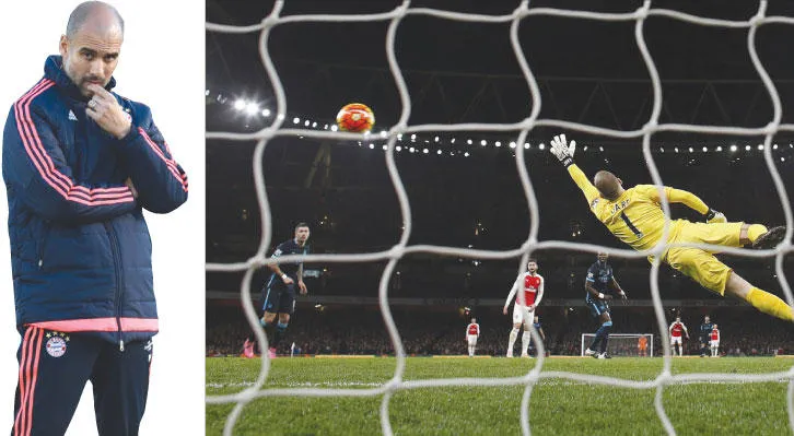هارت حارس مانشستر سيتي فشل في التصدي لتسديدة والكوت مهاجم آرسنال (أ.ف.ب)، أندية إنجلترا الكبرى تنتظر قرار غوارديولا (أ.ف.ب)