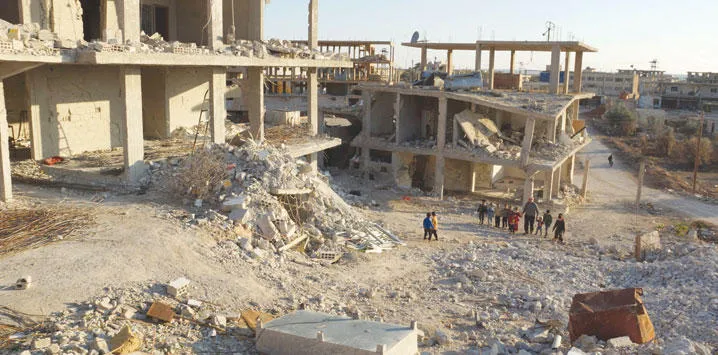 رجل مع أطفال سوريين يسيرون بين الأنقاض في إحدى مدن محافظة درعا أمس (رويترز)