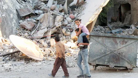 أطفال سوريون يمشون بحي زملكا بريف دمشق الذي تعرض لانفجار ضخم حوله إلى دمار أول من أمس (رويترز)