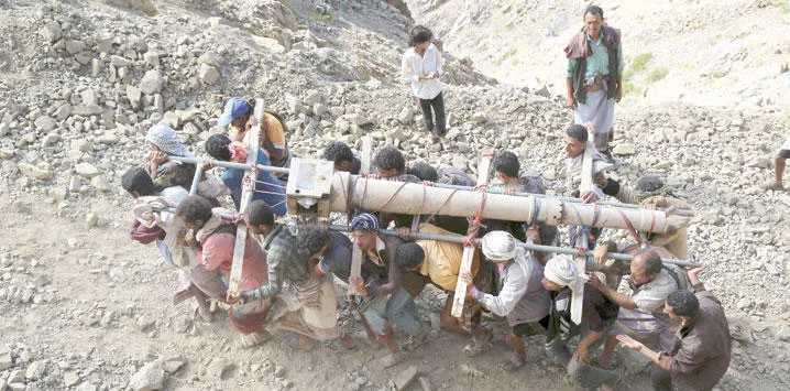 مقاتلون تابعون للمقاومة الشعبية يحملون مدفعا إلى إحدى جبهات القتال في مدينة تعز وسط اليمن أمس (رويترز)