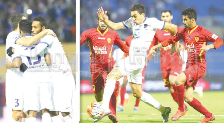 فريق القادسية ظهر جيدا في الشوط الأول قبل أن يتهاوى في الشوط الثاني (تصوير: علي العريفي)، فرحة هلالية بأحد الأهداف الأربعة في شباك القادسية.