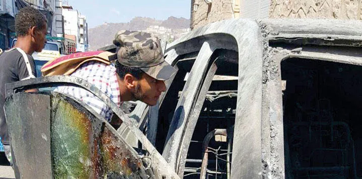 سيارة تم تفجيرها بعد ورود معلومات أنها تحمل متفجرات في عدن.. وفي الصورة بعض السكان يعاينون السيارة بعد تدميرها ({الشرق الأوسط})