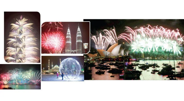 احتفالات السنة الجديدة في كوالالمبور عاصمة ماليزيا أمس (أ.ف.ب) - الألعاب النارية بتايوان في أطول ناطحة سحاب خلال احتفالات العام الجديد في تايبيه (رويترز) - طفلان يشاهدان كرة مضئية وخلفهما مسجد خلال الاحتفالات بالعام الجديد في مدينة غروزني، عاصمة الشيشان أمس (أ.ف. ب) - مشهد للألعاب النارية في ميناء فيكتوريا أثناء احتفالات العام الجديد في هونغ كونغ (إ.ب.أ)