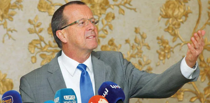 الممثل الخاص للأمين العام للأمم المتحدة مارتن كوبلر أثناء مؤتمر صحافي في مطار معيتيقة بطرابلس (رويترز)