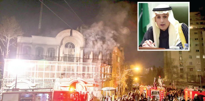 وقال وزير الخارجية السعودي عادل الجبير في مؤتمر صحافي إن المملكة تعلن قطع علاقاتها الدبلوماسية مع إيران، وتطلب مغادرة جميع أفراد البعثة الدبلوماسية الإيرانية والمكاتب التابعة لها خلال 48 ساعة.