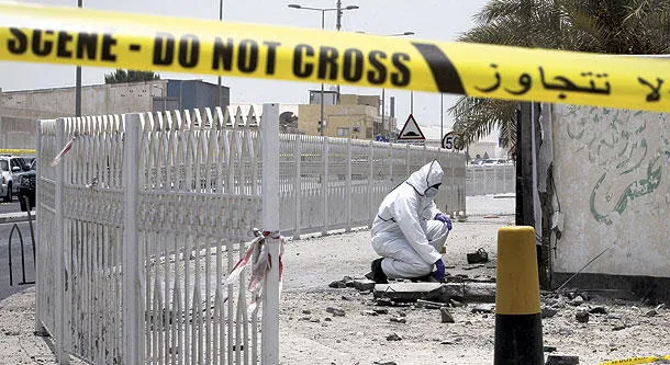 شرطي من المباحث الجنائية البحرينية لدى معاينته آثار تفجير قنبلة في جزيرة سترة جنوب البحرين اودى بحياة اثنين في يوليو 2015 (غيتي)