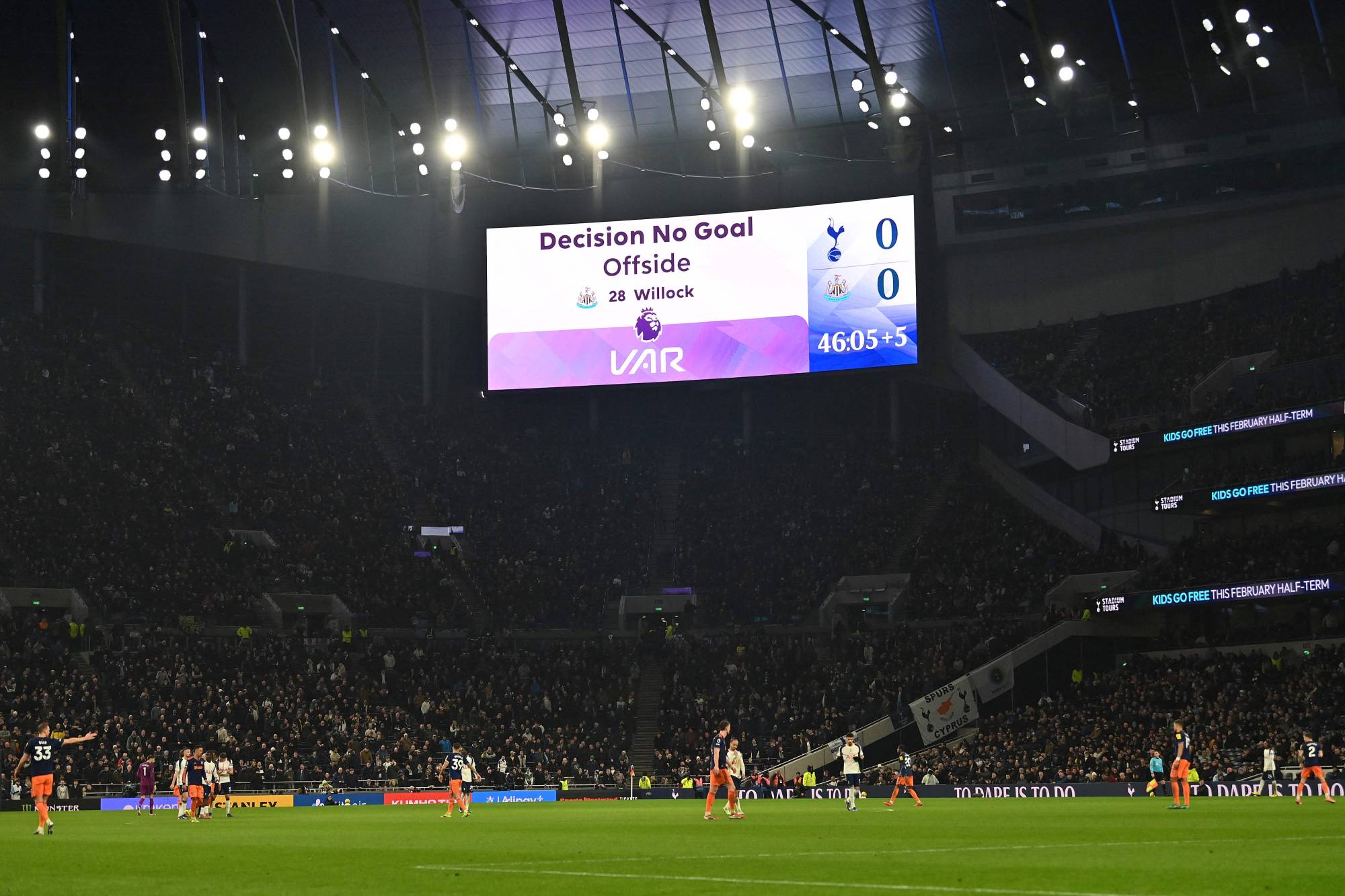 تعرض شاشة عملاقة قرار «لا هدف» عقب مراجعة من تقنية حكم الفيديو المساعد (أ.ف.ب)