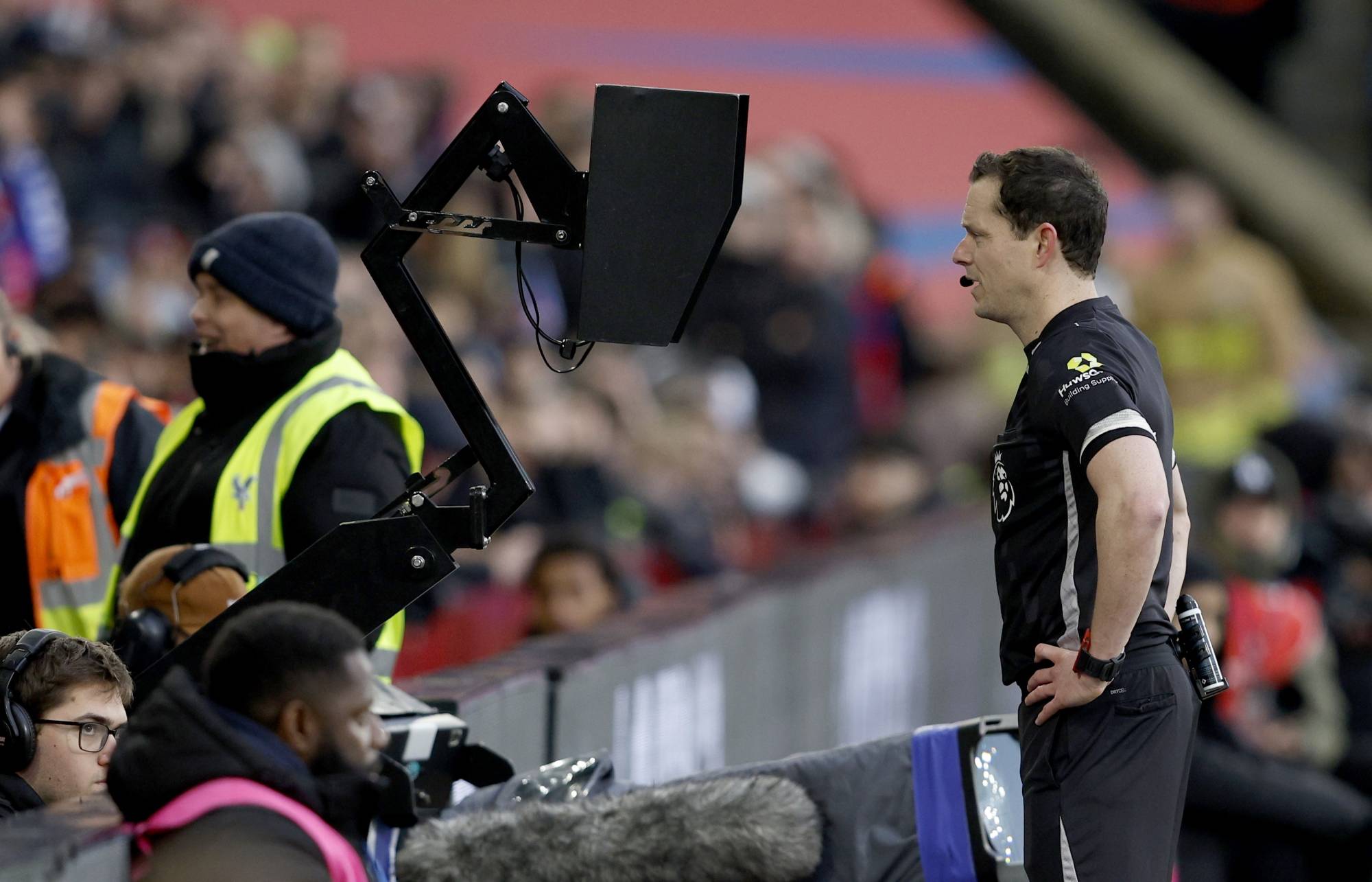 الحكم دارين إنغلاند يراجع الشاشة المراقبة للتحقق من ركلة جزاء احتسبت لاحقاً لتشيلسي (إ.ب.أ)