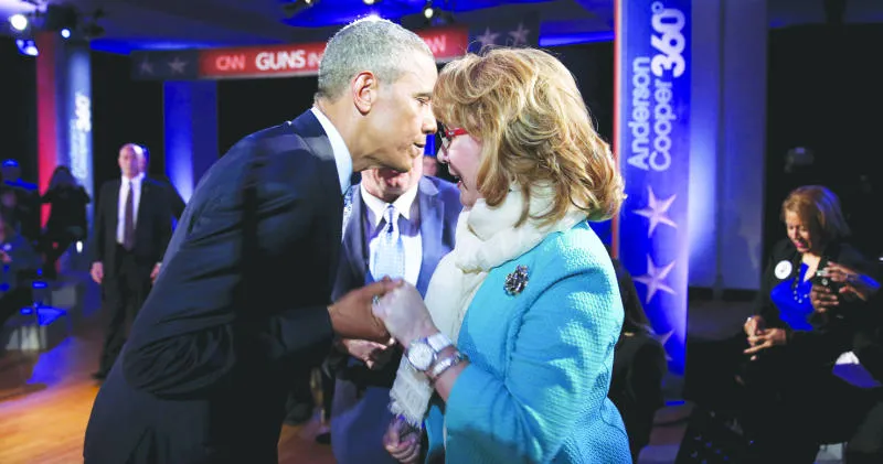 الرئيس الأميركي باراك أوباما يستقبل غابرييل جيفورد إحدى ضحايا الاعتداءات بالأسلحة النارية خلال ندوة نظمتها شبكة «سي إن إن» في فرجينيا مساء أول من أمس (رويترز)