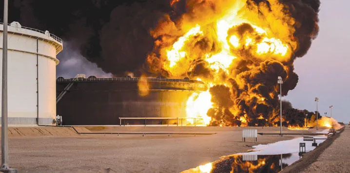 ألسنة النيران تتصاعد من خزانات البترول في مدينة رأس لانوف الليبية أثر هجوم ميليشيا {داعش} على المدينة (رويترز)