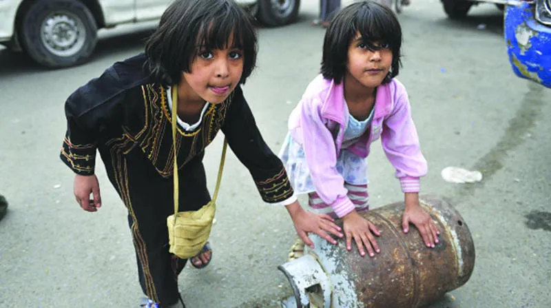 طفلتان يمنيتان تدحرجان أسطوانة غاز بصنعاء التي تعاني من عدة أزمات بسبب الحصار الحوثي للعاصمة (غيتي)