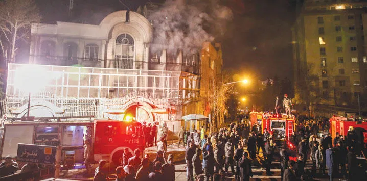 ألسنة النيران وأعمدة الدخان تتصاعد من مقر السفارة السعودية بطهران بعد اقتحامها (أ.ب)