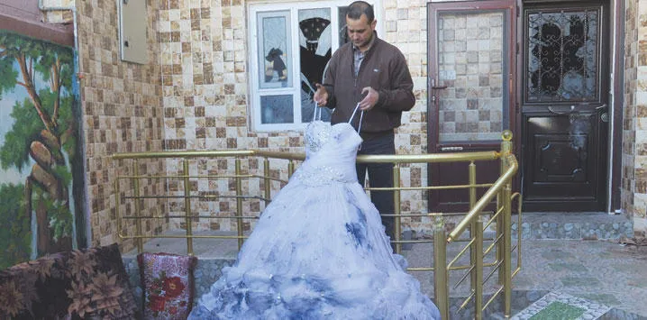 التركماني أحمد حسن مجيد يعرض فستان العرس الوحيد الذي بقي من بضاعتهالتي أتلفت باستهداف متجره خلال مواجهات طوزخورماتو (أ.ف.ب)