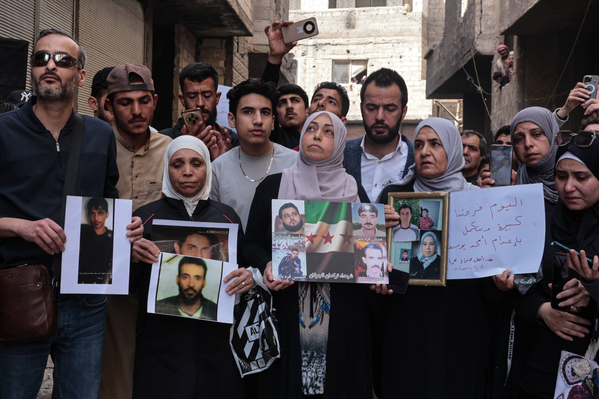 ورود وأعلام سورية وصور ضحايا بعد الإعلان عن القبض على المتهم بارتكاب «مجزرة التضامن» في حي التضامن بدمشق الجمعة (إ.ب.أ)