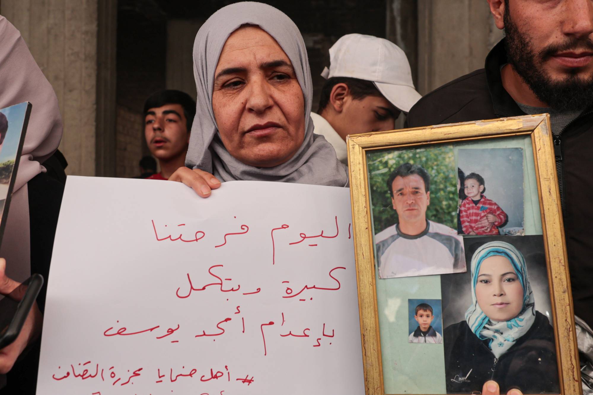 وبينما تجمعت حشود غفيرة من أهالي الحي أمام مسجد الزبير وسط الحي، خرج المصلون عقب أداء صلاة الجمعة يرددون صيحات «الله أكبر»، وهتافات تطالب بإلقاء القبض على من تبقى من مجرمين والقصاص منهم، ومنهم فادي صقر الذي كان يشغل منصب قائد ميليشيات «الدفاع الوطني» الرديفة لجيش النظام خلال سنوات الثورة، ويوجه له الأهالي اتهامات بأنه وراء حدوث هذه المجزرة. ومن بين الهتافات التي رددها المشاركون: «يا شهيد ارتاح ونام... أمجد يوسف على الإعدام».