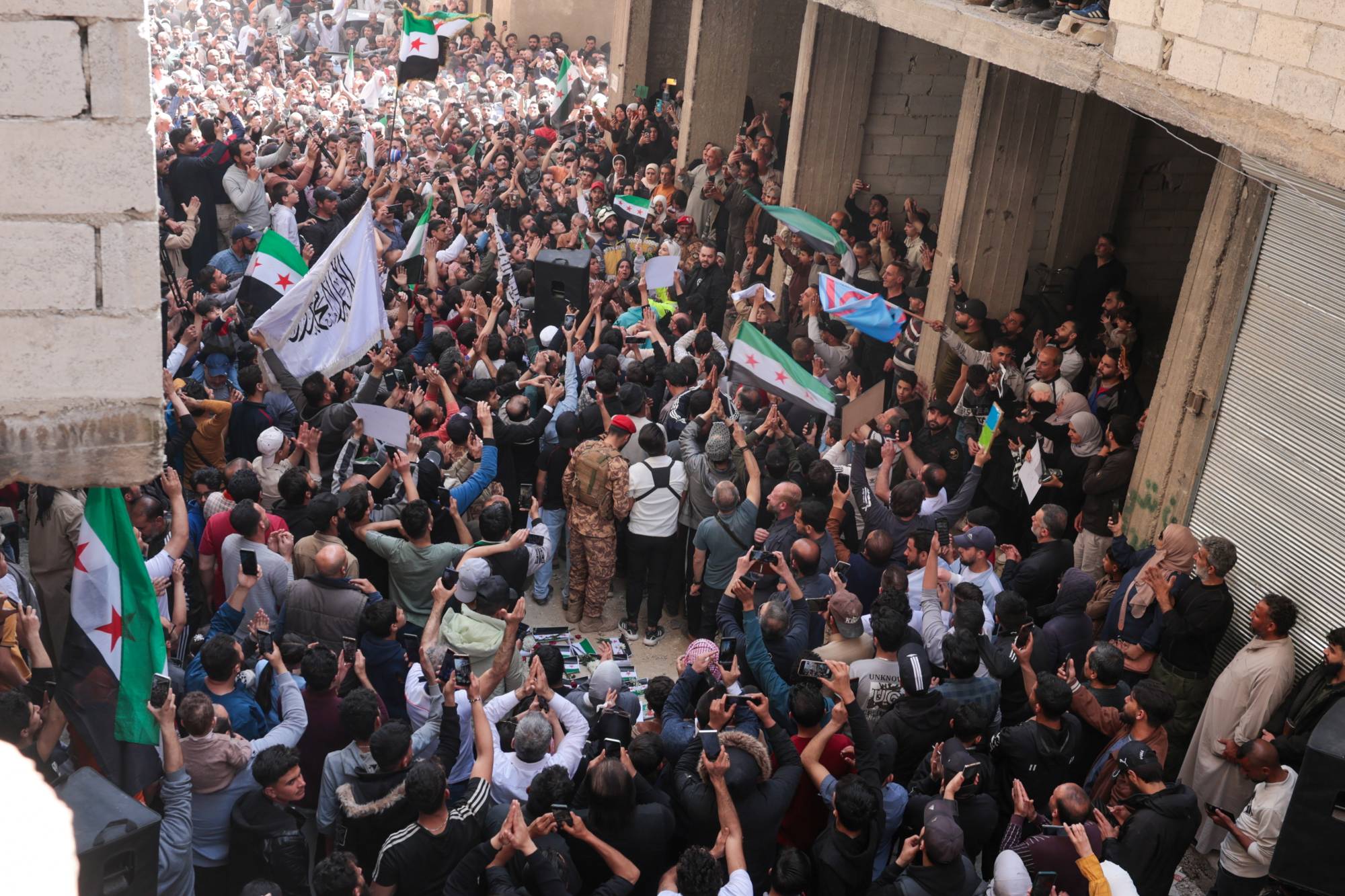 ورود وأعلام سورية بعد الإعلان عن القبض على المتهم بارتكاب «مجزرة التضامن» في حي التضامن بدمشق الجمعة (إ.ب.أ)