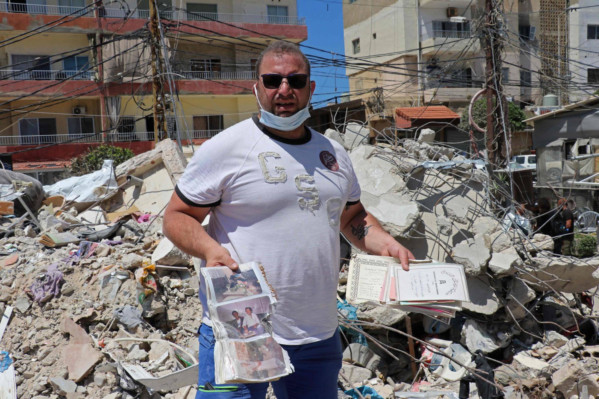 بتأثر شديد، يقول حجازي بعدما تسلّق أكوام الركام حيث عثر على ألبوم صور عائلي، «ذكرياتي كلها» في هذا المكان الذي اعتاد زيارته في الإجازات مع زوجته الفرنسية وطفلتيه. ويضيف: «كلنا مواطنون أبرياء... لا شيء في المنزل له علاقة بأحزاب».