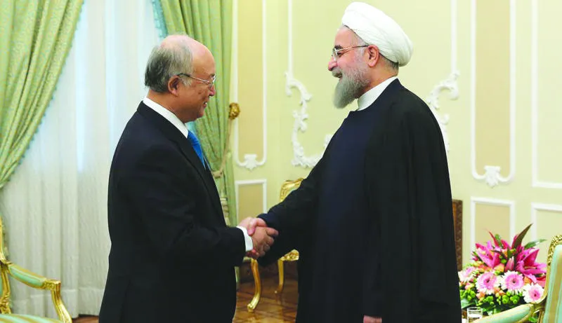 الرئيس الإيراني حسن روحاني لدى استقباله المدير العام للوكالة الدولية للطاقة الذرية يوكيا أمانو في طهران أمس (إ.ب.أ)
