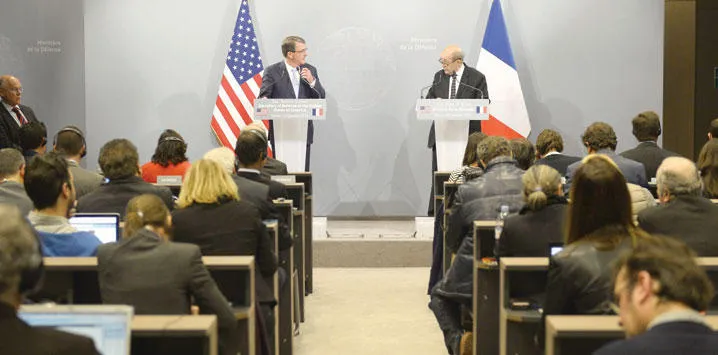 وزير الدفاع الفرنسي جان إيف لودريان ونظيره الأميركي آشتون كارتر خلال مؤتمر صحافي في باريس أمس (أ.ف.ب)