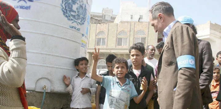 ممثل اليونيسيف جوليان هارنيس يستمع إلى أحد الأطفال في تعز المحاصرة (رويترز)