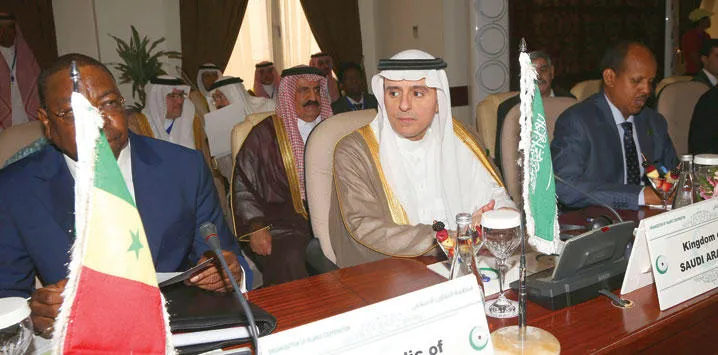 عادل الجبير وزير الخارجية السعودي لدى ترؤسه وفد بلاده في الاجتماع الطارئ لمنظمة التعاون الإسلامية أمس (واس)