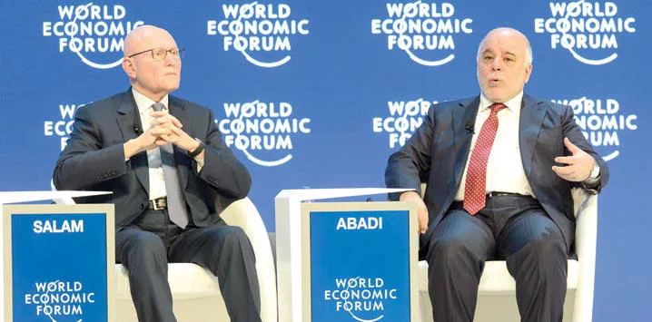 رئيس الوزراء اللبناني تمام سلام وإلى يمينه نظيره العراقي حيدر العبادي أثناء إحدى ندوات المنتدى الاقتصادي في دافوس السويسرية أمس (إ.ب.أ)
