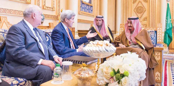 خادم الحرمين الشريفين لدى استقباله وزير الخارجية الأميركي جون كيري أمس (واس)
