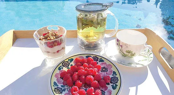5 - شاي الأعشاب: مكون من خلاصة أعشاب البابونج، والنعناع، والقراص، والهندباء. ويمكن إضافة مزيد من الأعشاب المحببة إليك، حيث تعمل الأعشاب مهدئًا ومنشطا للجسم ومزيلاً طبيعيًا للسموم.