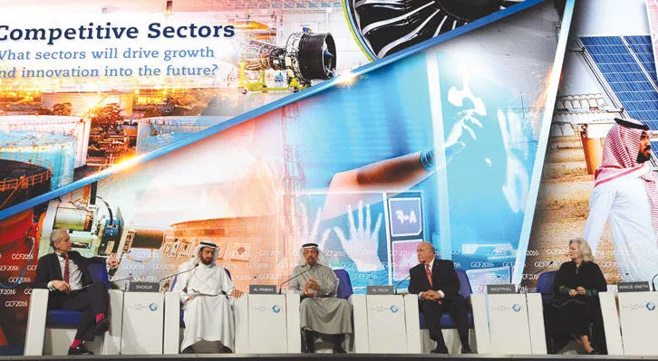 جانب من منتدى التنافسية أمس والفالح متحدثا فيه («الشرق الأوسط»)