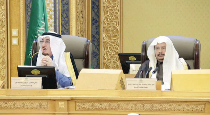 وزير العمل (يسار) خلال حضوره جلسة {الشورى} ويظهر رئيس المجلس ({الشرق الأوسط})