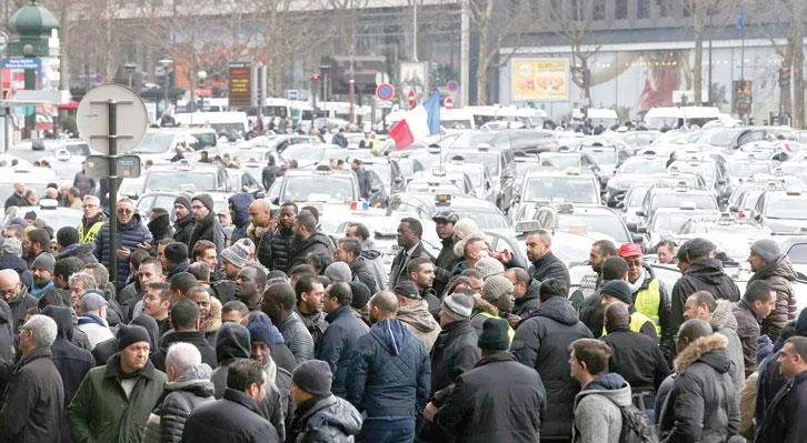 وشكل إضراب سائقي سيارات الأجرة الحدث الأكبر أمس، مع توقع حدوث اضطرابات في حركة النقل في باريس وحول مطاريها رواسي وأورلي، وسجلت بعض الحوادث صباحا، حيث جرح متظاهر في أورلي، بعدما صدمته حافلة صغيرة حاولت شق طريقها، وجرى توقيف سائقها الذي أوضح للشرطة أنه أسرع تحت تأثير الهلع. لكن بعد هذا الحادث عاد الهدوء، رغم مواصلة بعض المتظاهرين تحركاتهم وإقامة حاجز عند مدخل مطار أورلي.