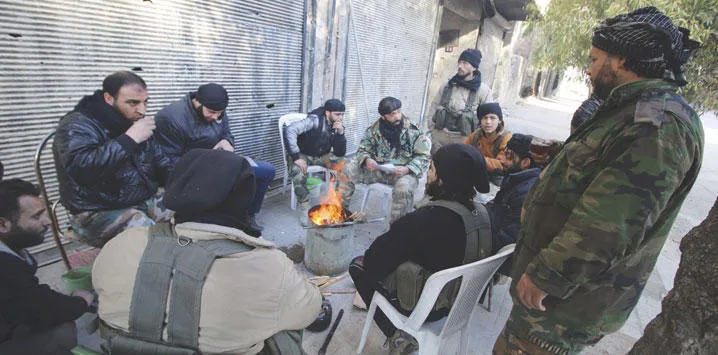عناصر من الجبهة الشامية يلتفون حول موقد نار طلبا للدفءفي أحد شوارع المدينة القديمة لحلب ({رويترز})