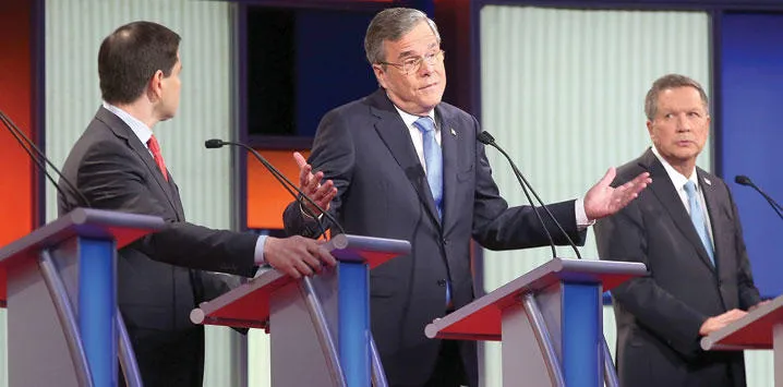 مناظرة تلفزيونية للمرشحين عن الحزب الجمهوري إلى البيت الأبيض وهم من اليمين: جون كاشيك وجيب بوش وماركو روبيو (أ.ف.ب)