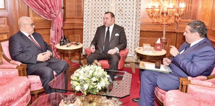 العاهل المغربي الملك محمد السادس خلال استقباله رئيس الحكومة عبد الإله ابن كيران وعزيز أخنوش وزير الفلاحة والصيد البحري في القصر الملكي بالدار البيضاء أول من أمس (ماب)
