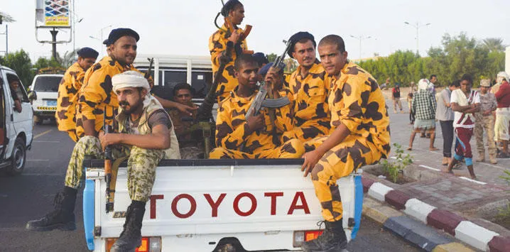 عناصر أمن يمنيون يصلون إلى موقع تجمع شبي في المدينة الجنوبية عدن (أ.ف.ب)