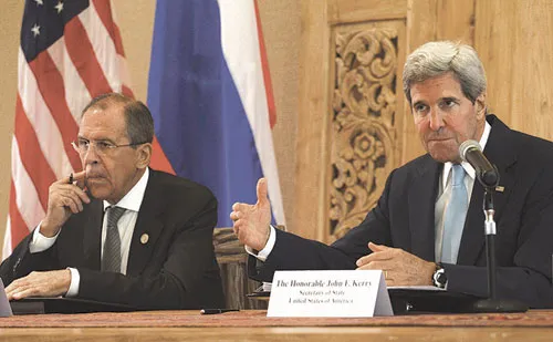 وزيرا الخارجية الأميركي جون كيري والروسي سيرغي لافروف خلال مؤتمر صحافي في بالي بإندونيسيا أمس (أ.ب)