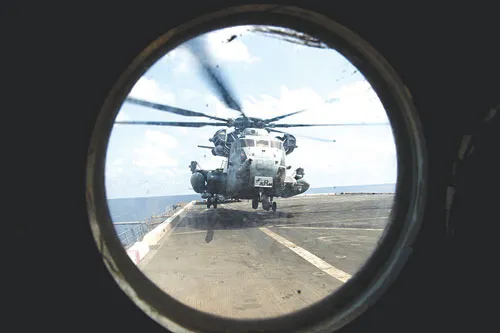 طائرة هليكوبتر أميركية تحط على حاملة الطائرات سان أنطونيو التي يستجوب فيها قيادي القاعدة أبو أنس الليبي في المتوسط (أ.ف.ب)
